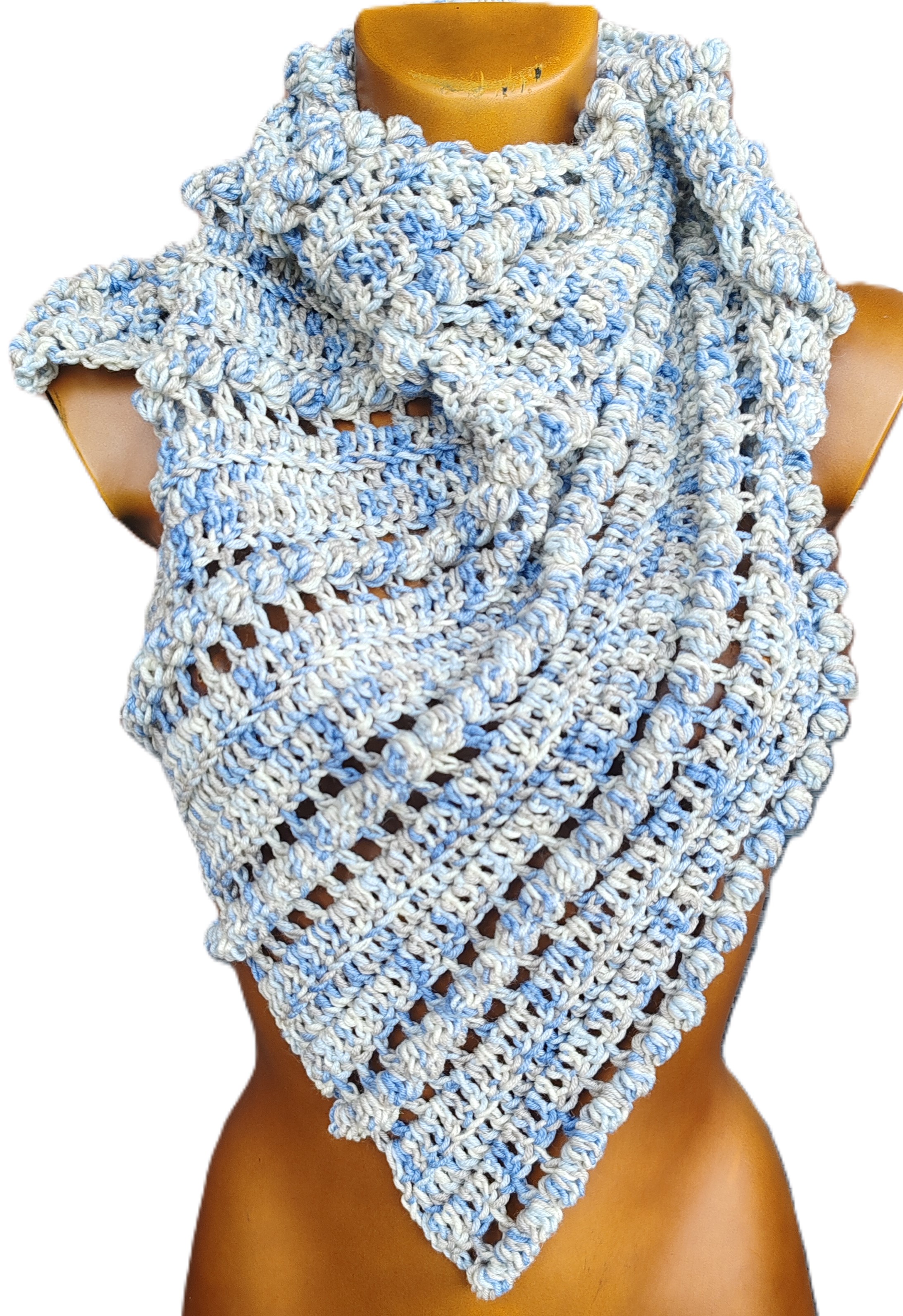 20% seda, 75% merino extrafino y 5% Cachemira, en una gama de tonos pastel en azul celeste, gris claro y blanco. Colores que combinan con todo y para todas las ocasiones