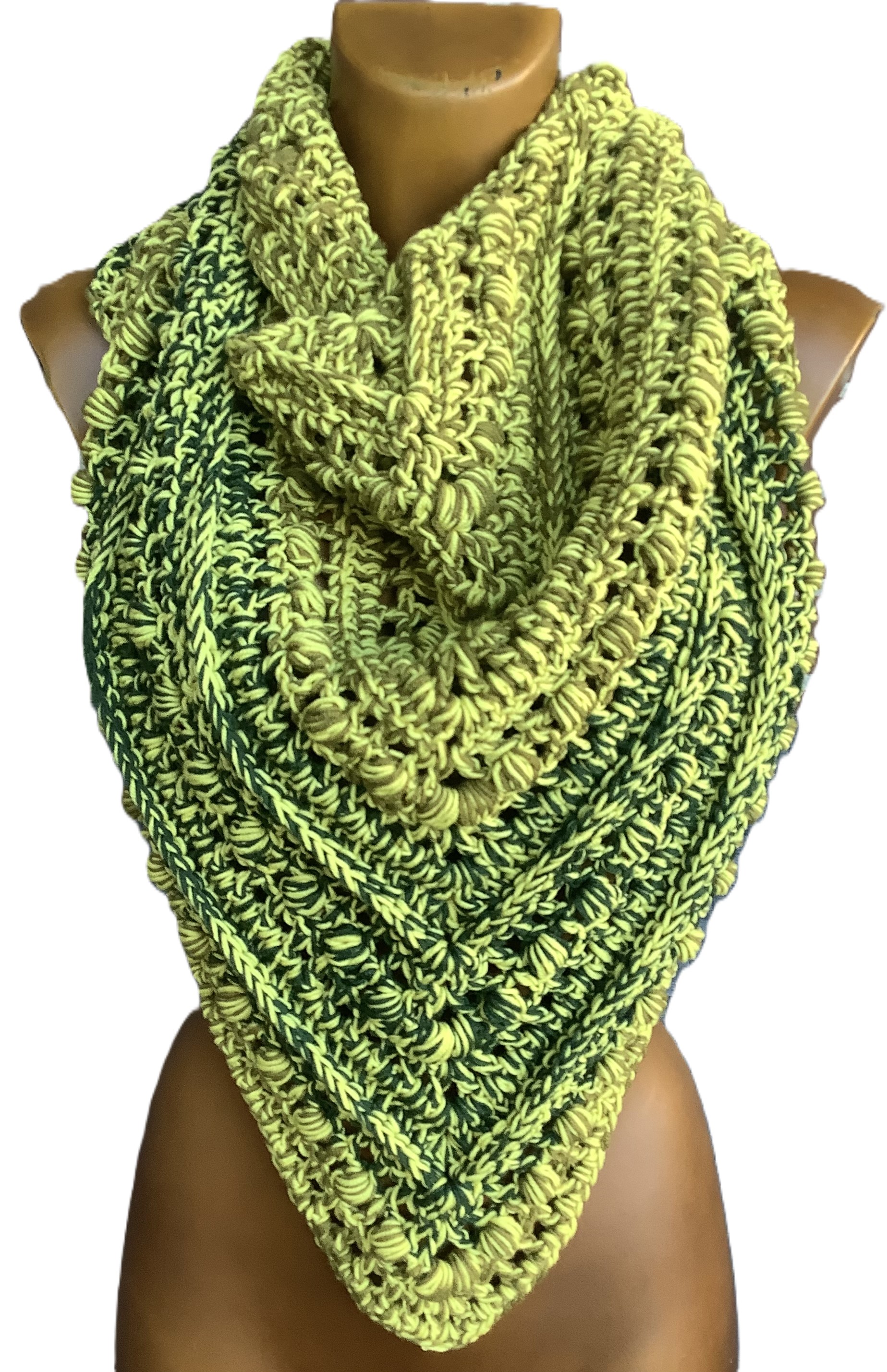 Lana merino fina, combinando dos tonos, un verde seco con un verde mas botella Lavar en frío o a mano. No usar secadora