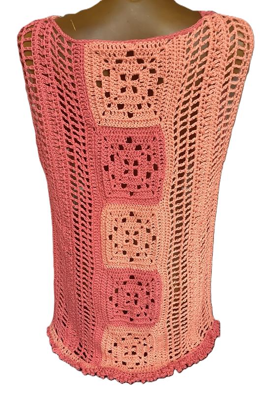 Algodón color coral y color salmón. Tejido 100% en algodón, súper suave. Talla M/L. Espalda con dibujo de grannys combinando los dos colores, al igual que los delanteros que va uno de cada color.