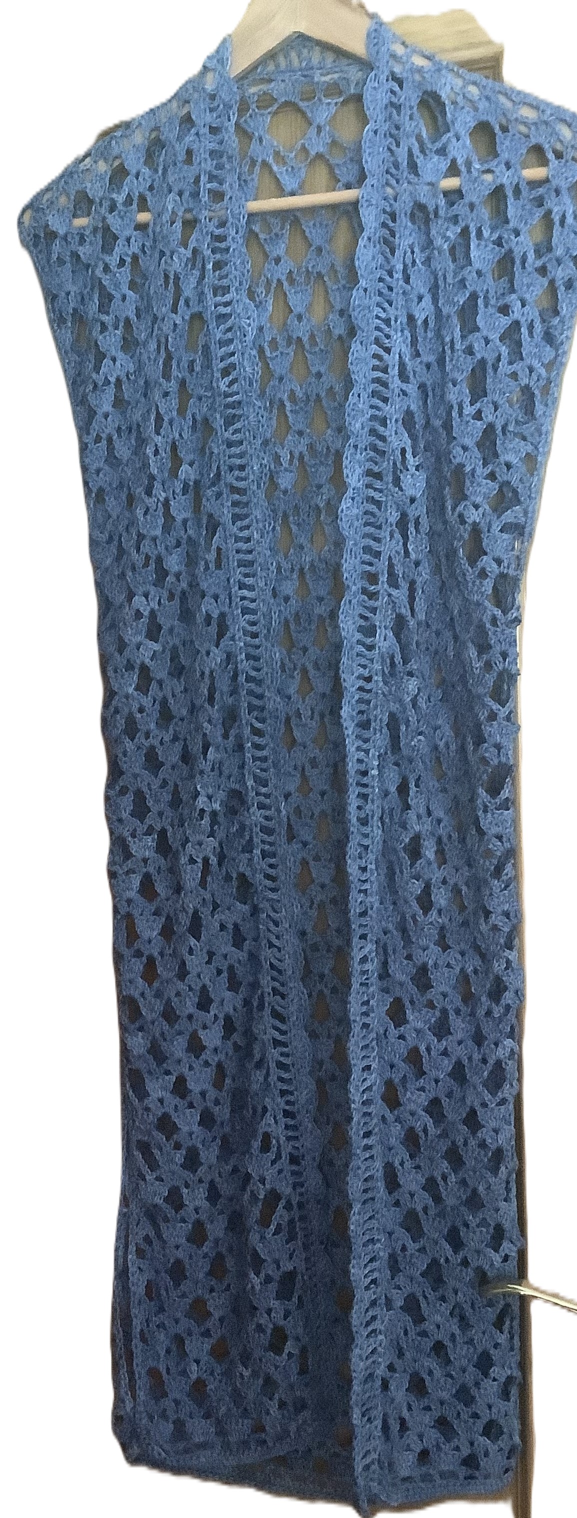 Algodón azul jeans reciclado. Tejido 100% en algodón, súper suave. Talla M/L. Largo y con dibujo calado que lo hace un indispensable para esta primavera-verano Talla única que se adapta a prácticamente todas las tallas