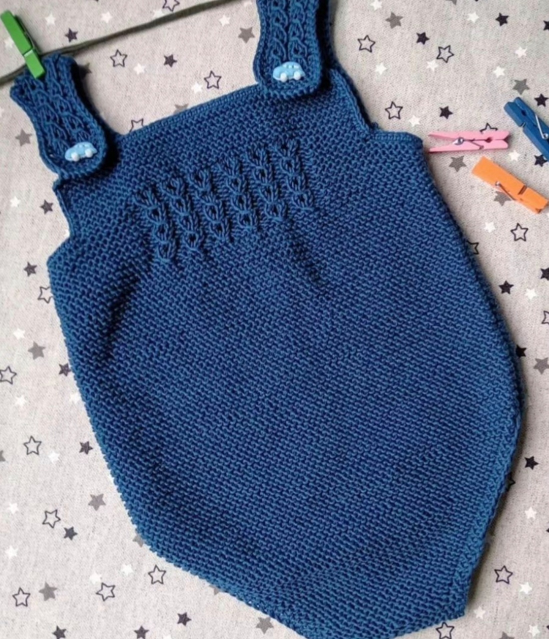 100% algodón azulón, con botones en los tirantes en forma de coche. Talla 3-6 meses. Apertura para cambiar muy fácil el pañal