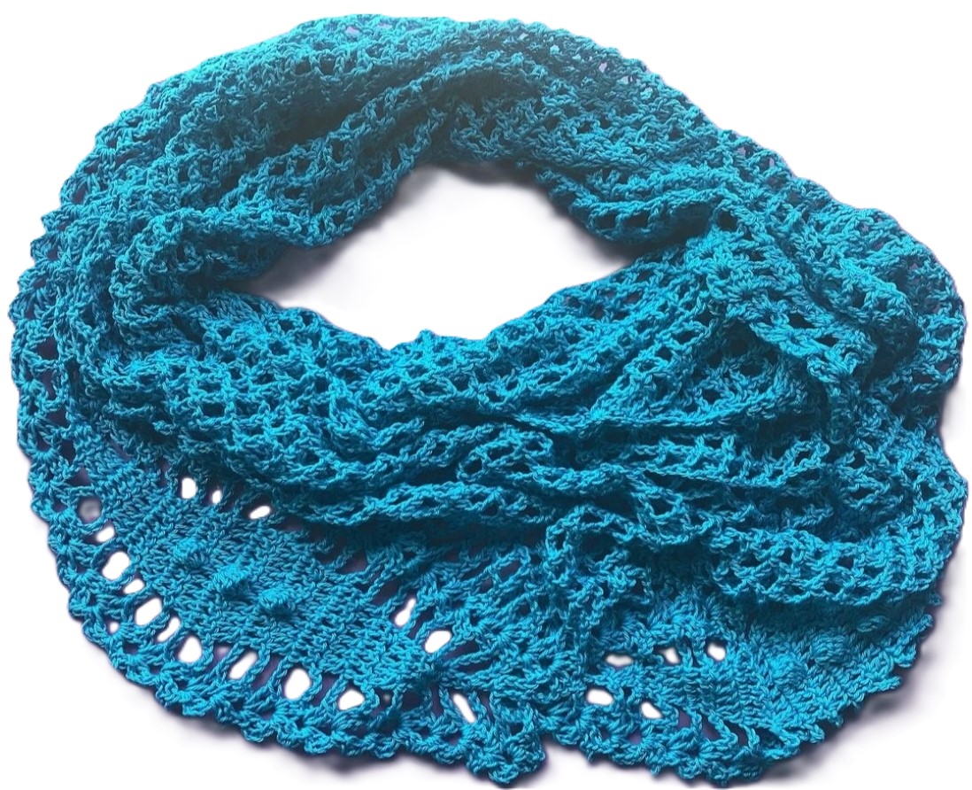 Pañuelo desigual, con punto de red y detalles en un lado mientras que el otro va quedando sencillo. Acrílico tipo algodón en un azul eléctrico super bonito