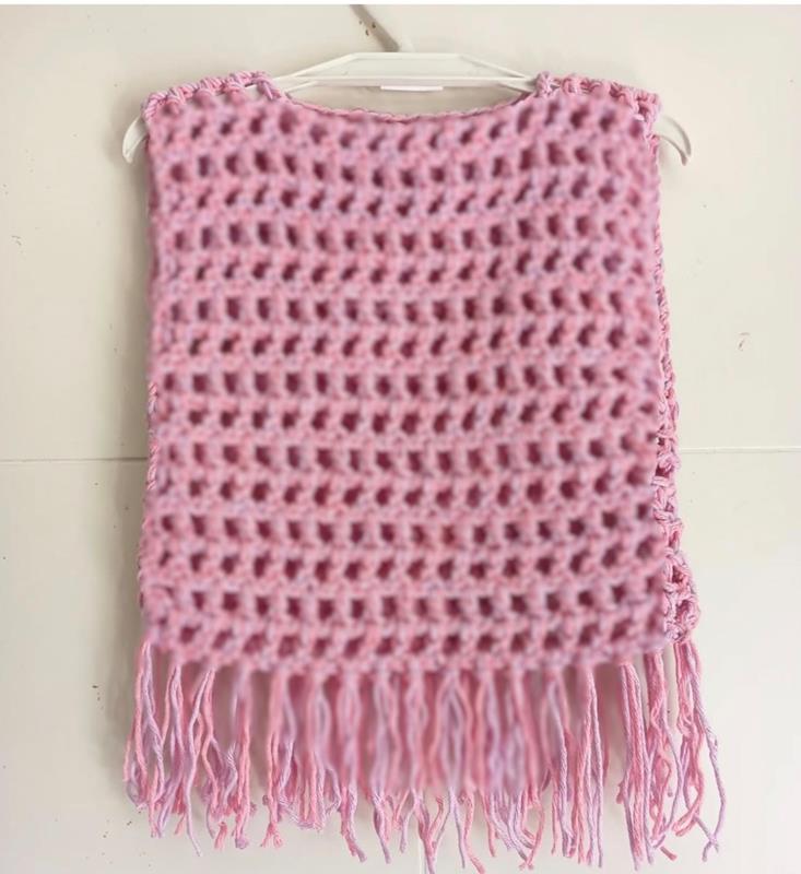 100% algodón mezclando rosa y lila, con terminación en flecos. Sirve de top, como de chaleco. Por su talla también puede encajar para niñas de 12 años en adelante