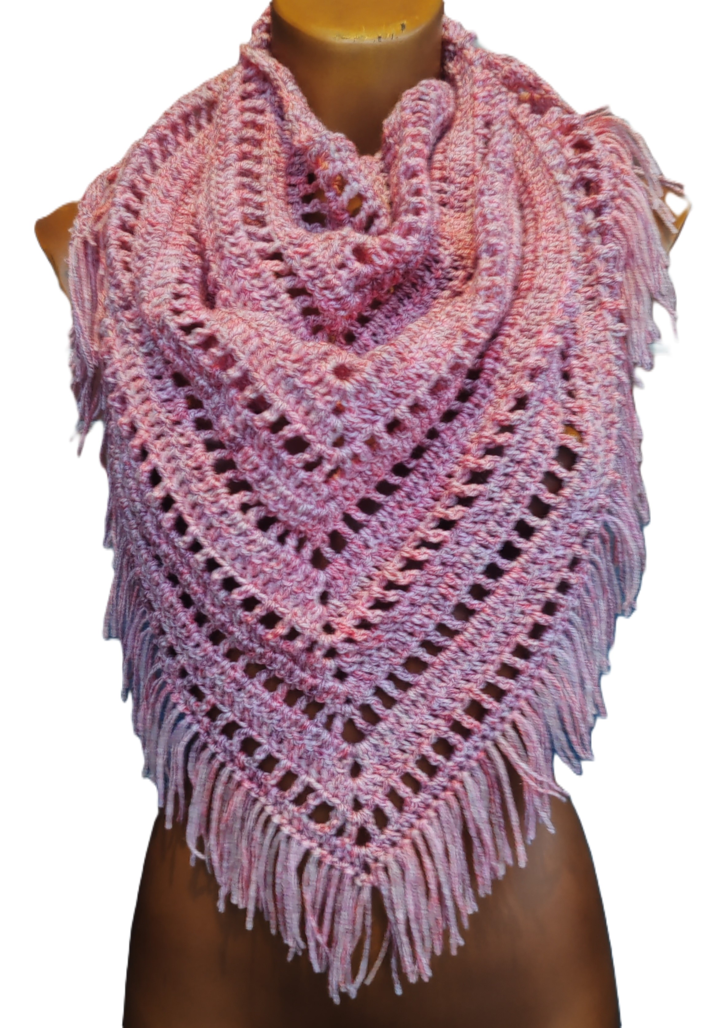 Pañuelo en forma de pico, punto sencillo intercalado con punto red amplio 80% Acrílico y 20% Merino Varios rosas y un toque de lila, que va mezclándose en el tejido