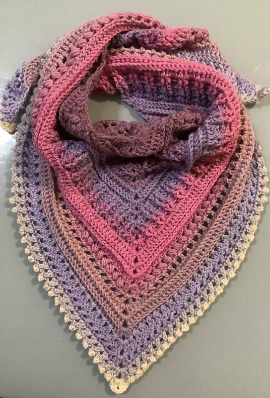 Pañuelo en forma de pico, punto sencillo intercalado con punto red amplio 80% Acrílico y 20% Merino Variación de colorido dentro de las gamas pastel de rosa y lila