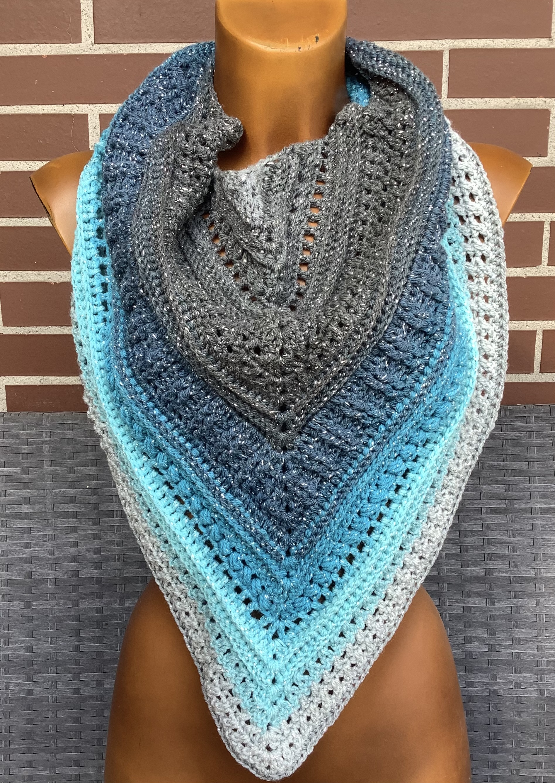 Pañuelo en forma de pico, puntos diferentes intercalados en degrades azules y grises