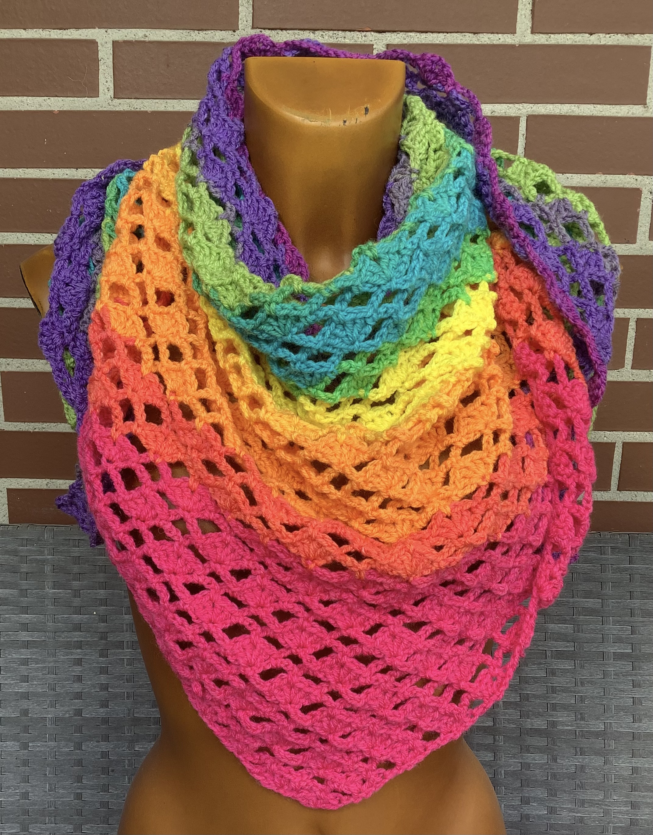 Pañuelo en forma de pico, puntos intercalados haciendo 0ndas, en tonos alegres y llamativos 20% Acrílico y 80% Merino Ponle color a tu armario en el Otoño invierno