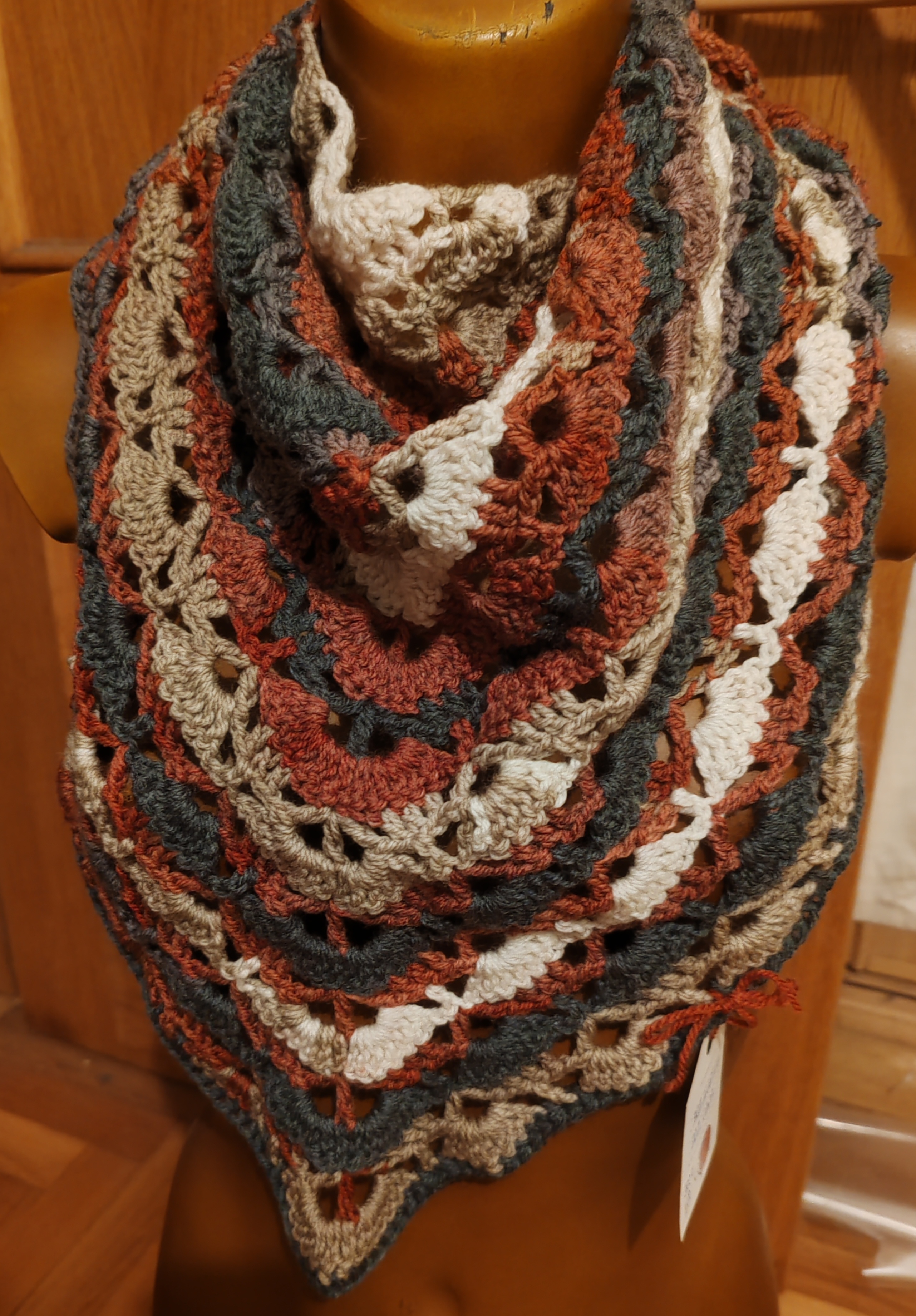 Pañuelo en forma de pico, puntos intercalados haciendo dibujos imitando a medias ondas o conchas 80% Acrílico y 20% Lana Colores marino, granate, beis y tape, que vienen pisando fuerte esta nueva temporada