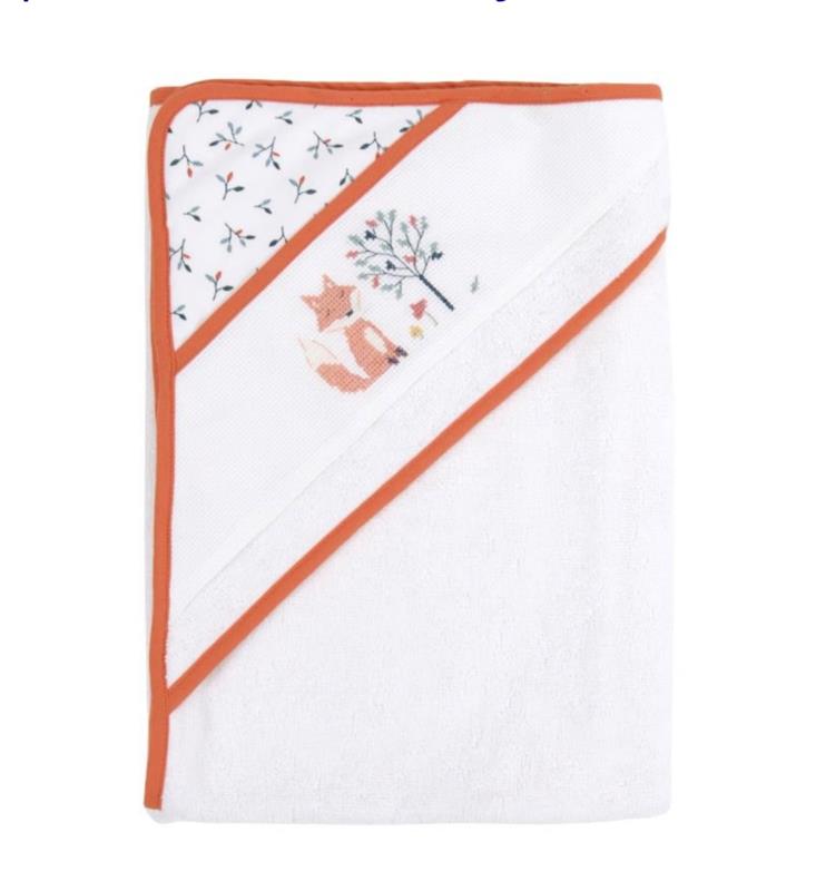 Toalla de rizo de primera calidad, en blanco, con rectángulo de toalla y doble tela para bordar, donde meter la cabeza de tu bebé para después enrollarlo y secarlo.